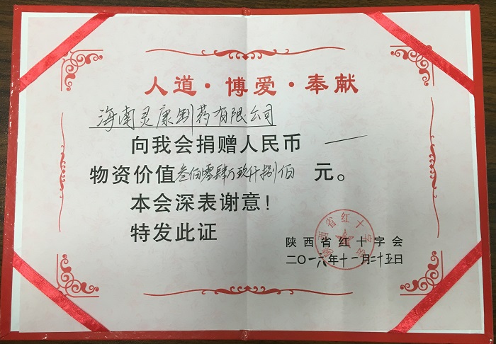 2016年12月2日,海南灵康制药有限公司向陕西省红十字会捐赠价值305万元的药品,用于陕西省部分地区贫困家庭疾病患者的免费医疗救助。
