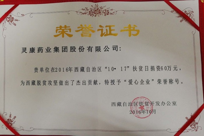 2012年10月13日,陶灵萍董事长参加了由长江商学院第十九期EMBA班学员——最高人民检察院公诉厅副厅长、西藏自治区人民检察院副检察长侯亚辉倡导的“雪域高原公益行”活动。陶灵萍董事长在西藏拉萨市城关区吉崩岗小学的捐赠活动上,代表灵康药业集团分别向西藏拉萨、山南和林芝地区捐赠了价值127万元、100万元、100万元的药品,其中包括注射用炎琥宁、注射用头孢唑肟钠等,合计价值327万元。