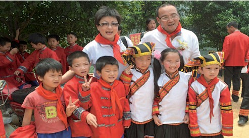 陶灵萍董事长与边区孩子们合影(后排左一为陶灵萍董事长)