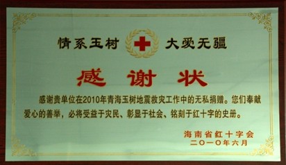 2010年4月,灵康药业集团股份有限公司组织员工在玉树大地震中奔赴一线提供救援服务,并启动紧急救援行动,第一时间向海南省红十字会捐赠救灾物资和善款,累计价值116万元。