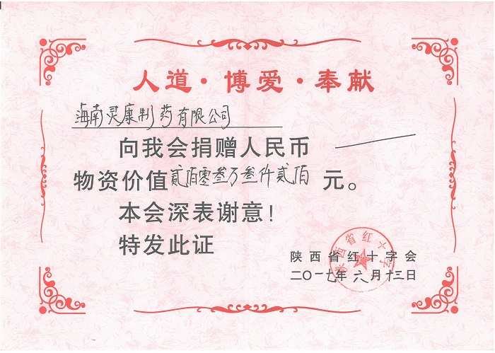 2017年6月26日,海南灵康制药有限公司向陕西红十字会捐赠价值203万元的药品,用于陕西省部分地区贫困家庭疾病患者的免费医疗救助。